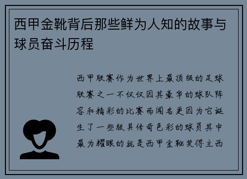 西甲金靴背后那些鲜为人知的故事与球员奋斗历程